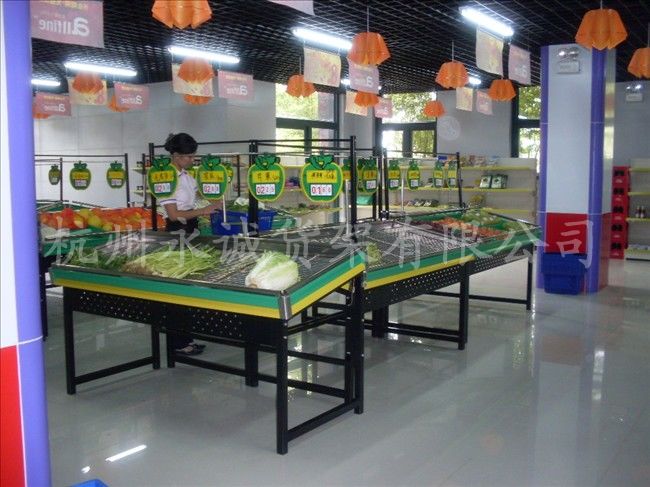 蔬果超市货架分为干菜家和水菜架,可以放水果和蔬菜。材料是不锈合金电解材料做成,美观,干净。