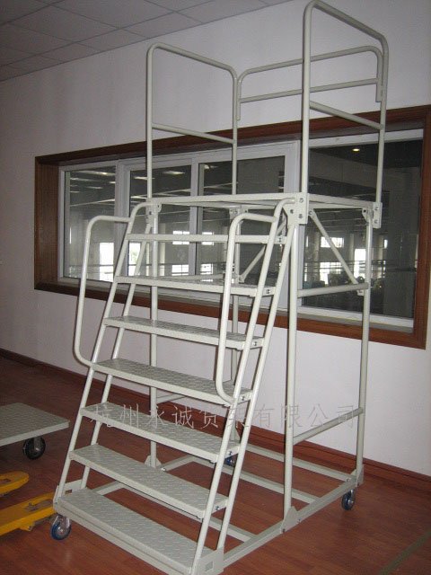 登高车常见规格H1500/H1800,骨架30*30*1.5方管,平台面及踏步板为2.5花纹板,含两个定向脚轮,两个万向脚轮带刹车.